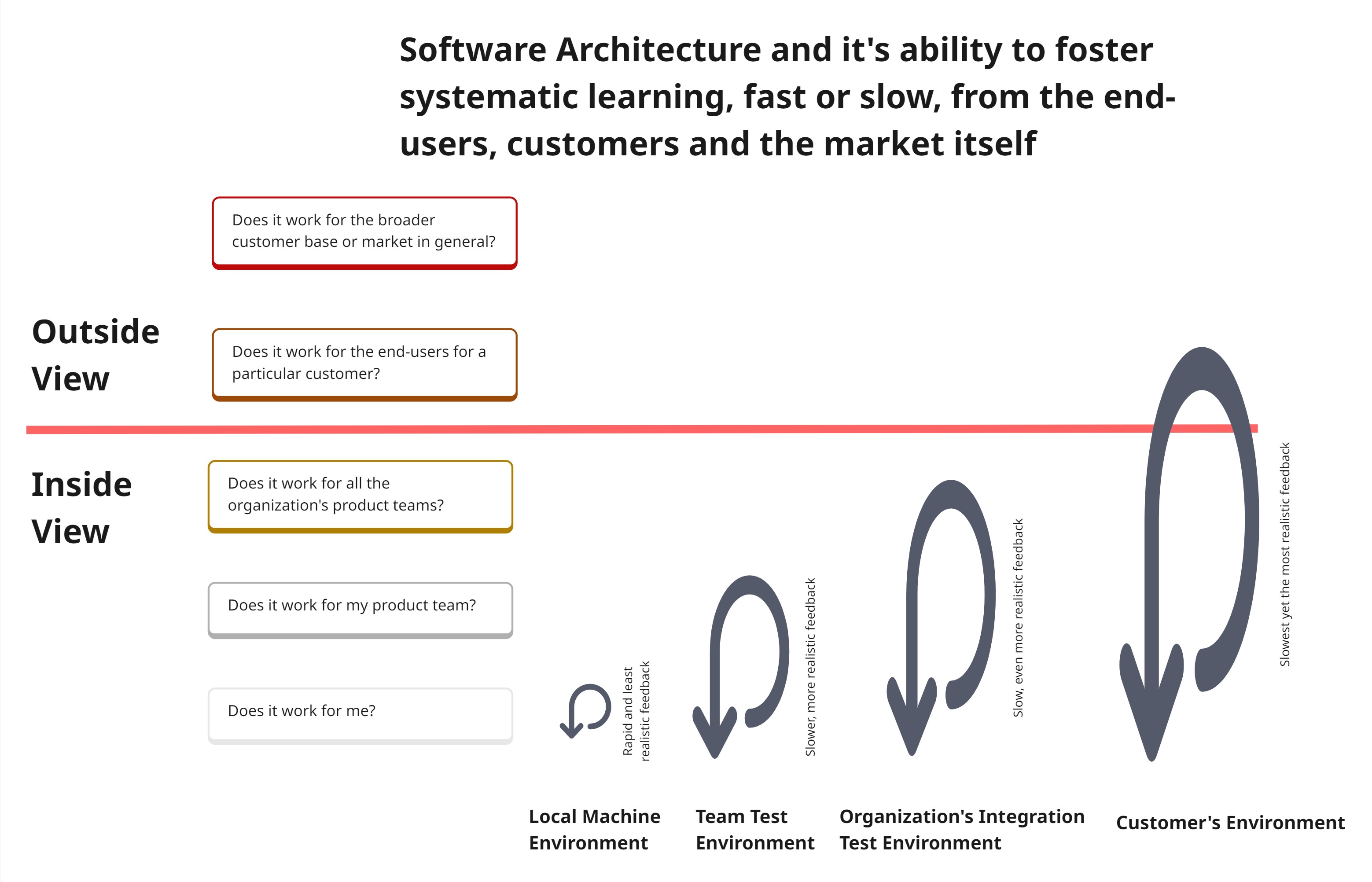 Whether or not you are dealing with a small organization or an organization at scale the realistic feedback loop occurs only on the Outside View, where we let end-users, stakeholders and the market guide our decision making. The challenge is much bigger in a scaling organization due to longer time it takes to facilitate learning. This is the real purpose of software architecture, shortening the feedback loops from the Outside View to the inner organization structure.