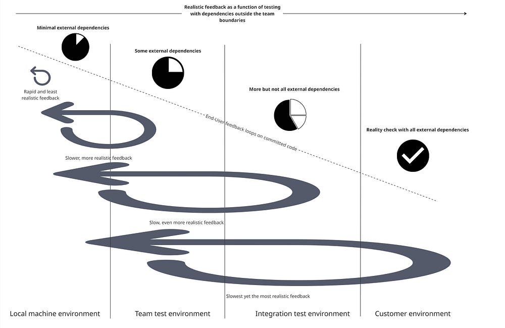 At this point somebody usually suggests to split the source code in multiple repositories. With multirepo, all of a sudden the developer experience improves and product teams work fast again, feeling autonomy and flow in the daily work. On the other hand, as a shrewd consequence of this seemingly natural choice, the overall product testing becomes more costly. The distributed development environment has in fact extended the testing feedback loop to the integration environment.
